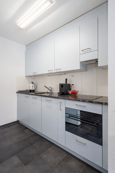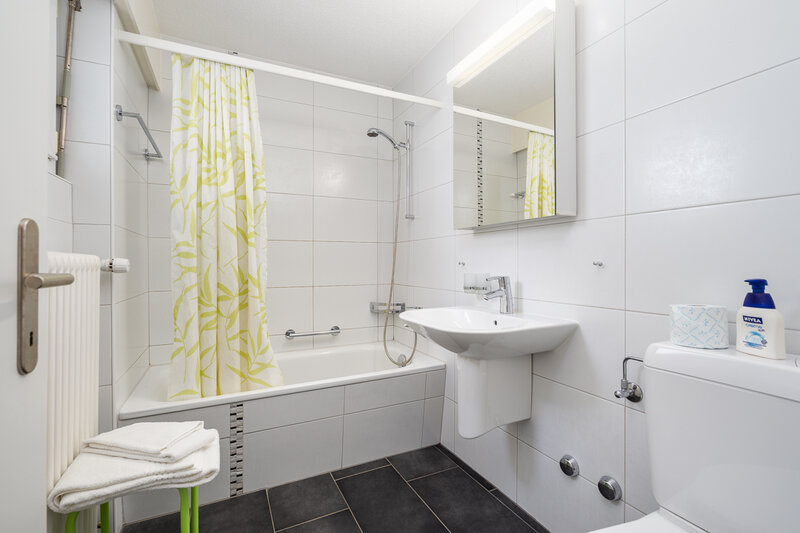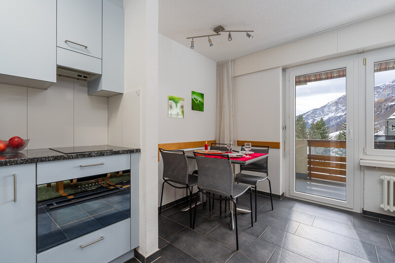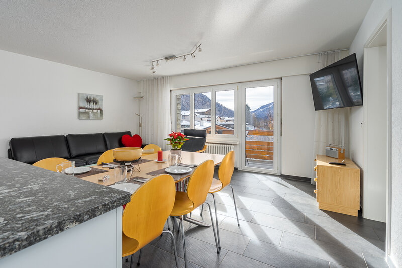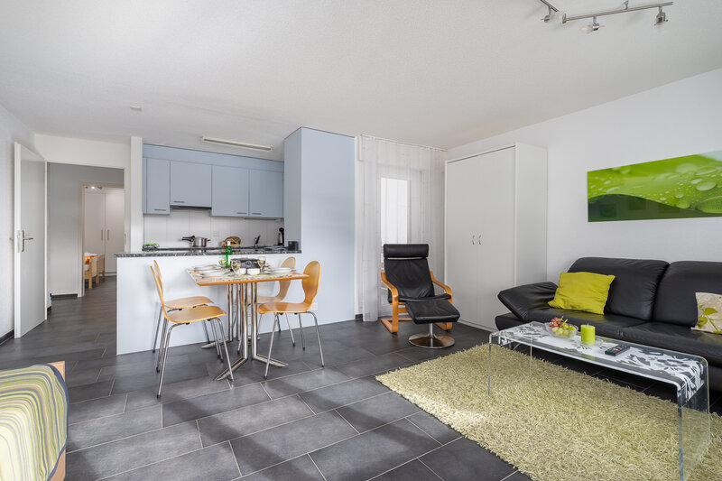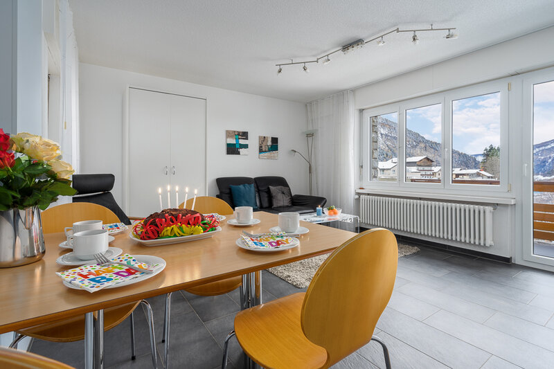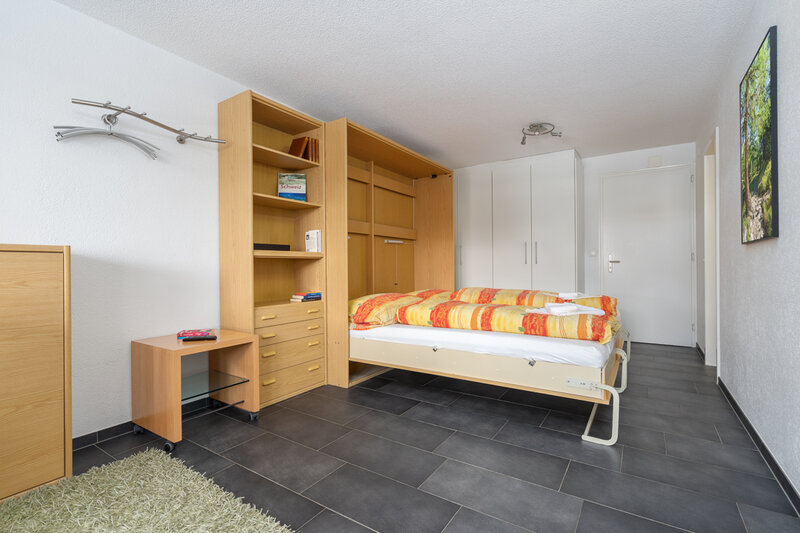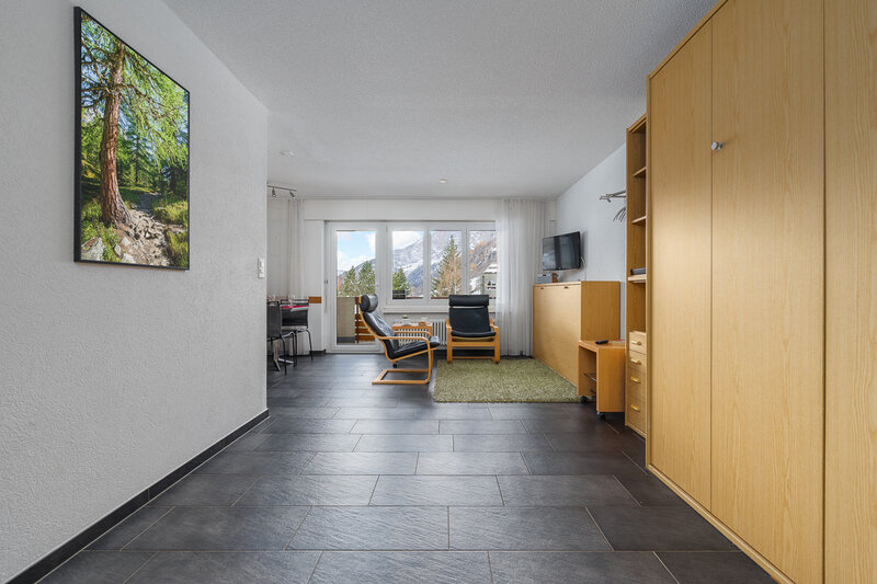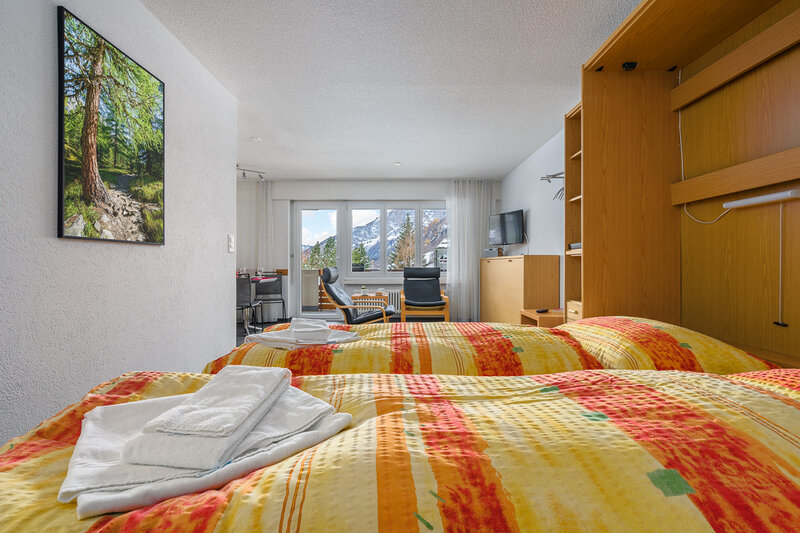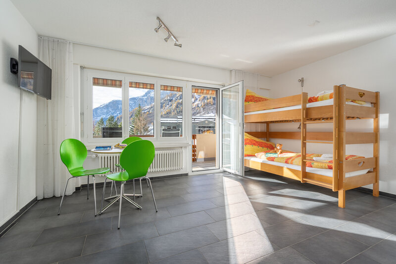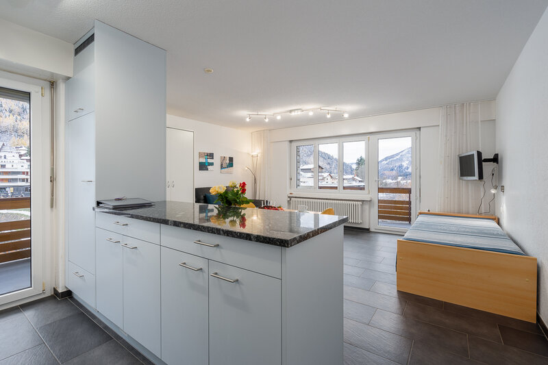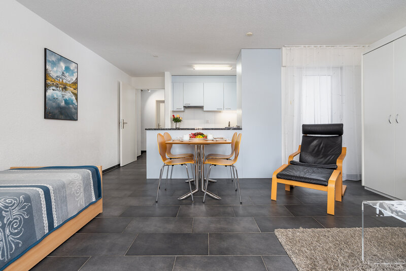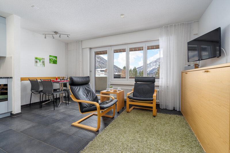 Das Studio (Nr. 25, 1½-Zimmer, ca. 30 m2) bietet Platz für bis zu 3 Personen. Es verfügt über ein geräumiges Wohnzimmer mit zwei Schrankklappbetten, einem Wandklappbett, zwei bequemen Sesseln, TV, WLAN, Esstisch, Balkon mit Sonnenstoren, Tisch und Wäscheständer, eine gut ausgestattete halboffene Küche mit Geschirrspüler, Mikrowelle, Kaffeemaschine, Toaster, Wasserkocher, Fondue-Caquelon und Raclette-Ofen sowie ein Badezimmer mit WC/Dusche und Föhn.