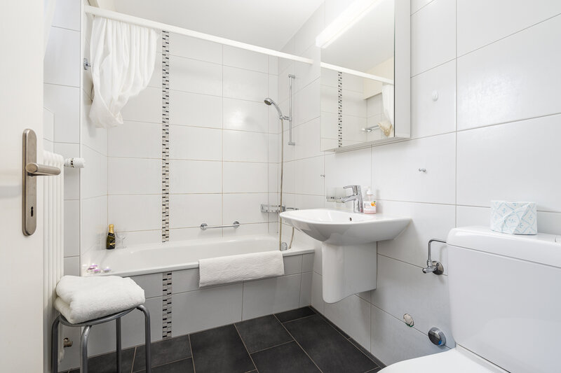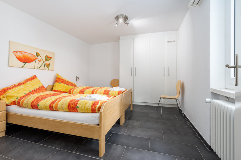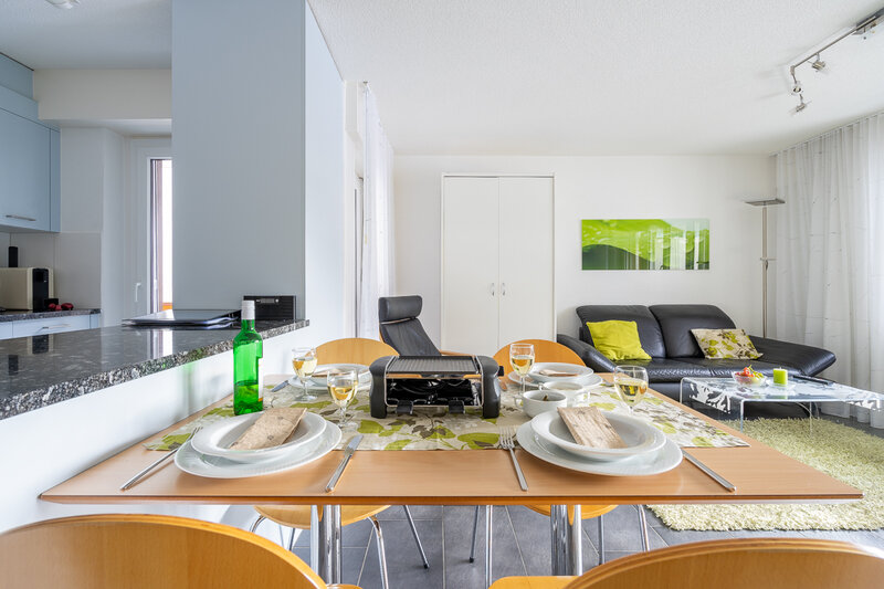 Die mittleren Wohnungen (17 und 37, 2 Zimmer, ca. 50 m2) bieten Platz für bis zu 4 Personen. Sie verfügen über ein Doppelzimmer, ein geräumiges Wohnzimmer mit einem ausziehbaren Doppelcouchbett, Sofa, Sessel, TV, WLAN, Esstisch, Balkon mit Sonnenstoren, Tisch und Wäscheständer, eine gut ausgestattete offene Küche mit Geschirrspüler, Mikrowelle, Kaffeemaschine, Toaster, Wasserkocher, Fondue-Caquelon, Raclette-Ofen und kleinem Balkon sowie ein Badezimmer mit WC/Badewanne und Föhn.